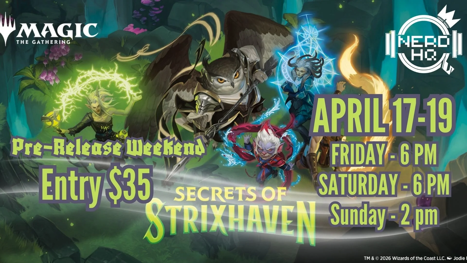 Show your school pride before release day! Attend a Prerelease event for a Prerelease Pack and be one of the first to choose your school and uncover the secrets of Strixhaven. These kits include everything you need to play, plus a Prerelease promo card and a college-specific spindown die to track your life count.